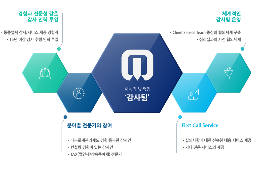 정동회계법인의 차별화된 경쟁력의 핵심은 전문가들의 역량에 있습니다. 10년 이상 기업들의 감사/전문 서비스를 수행해 온 경험을 갖춘 전문가들로 구성된 감사팀은 기업의 상황을 고려한 최적의 해법을 제시하며, 퍼스트 콜 서비스를 통해 고객이 필요로 하는 시점에 원하는 서비스를 즉시